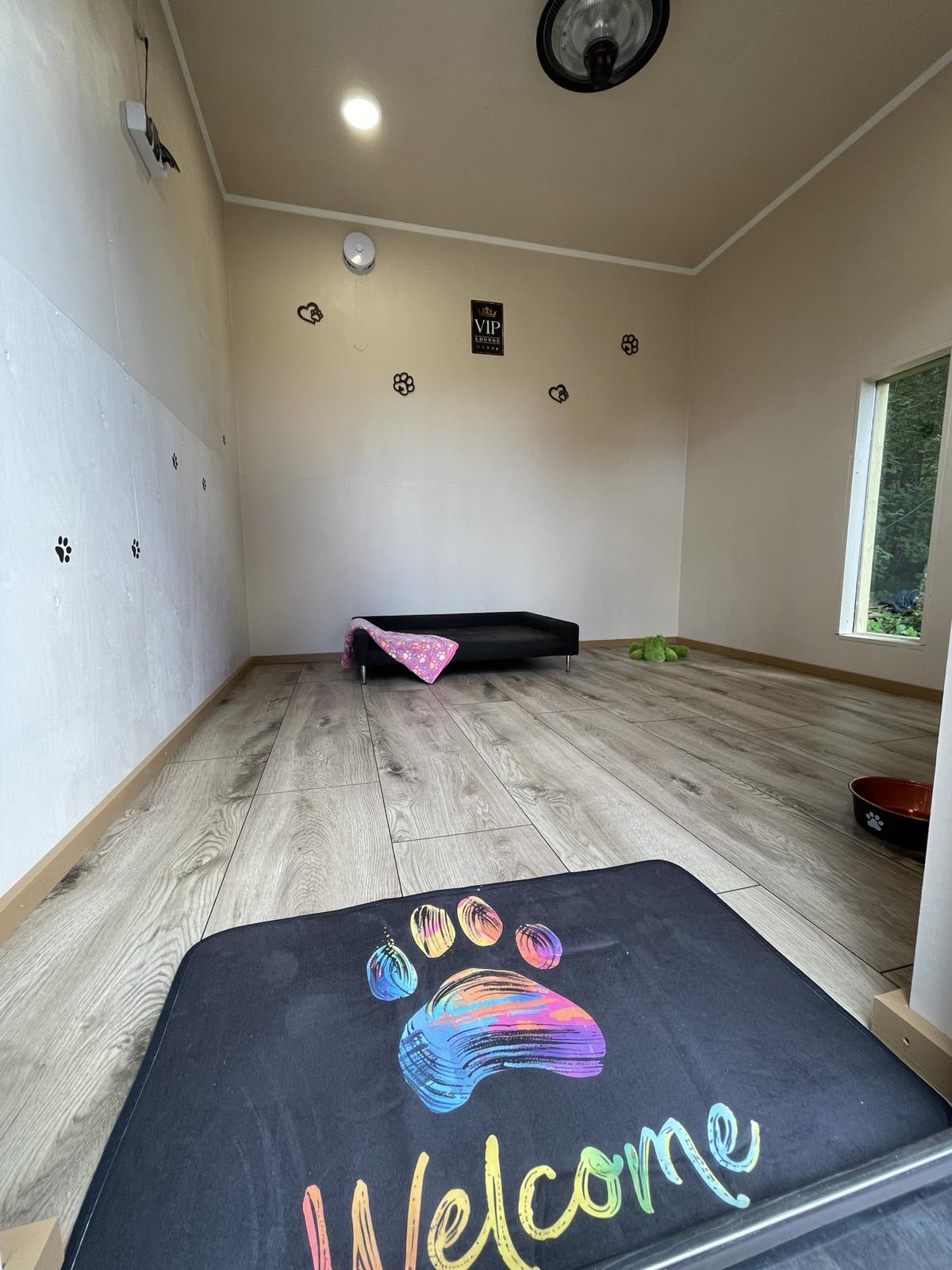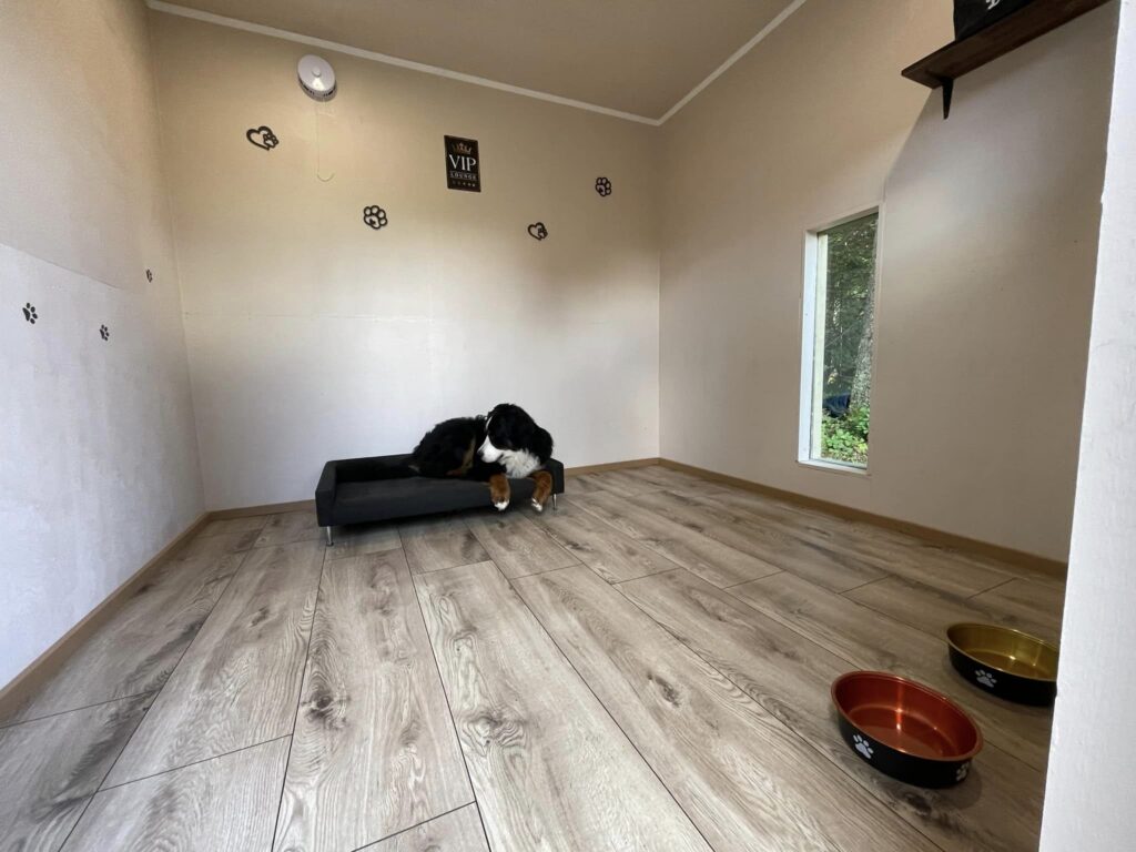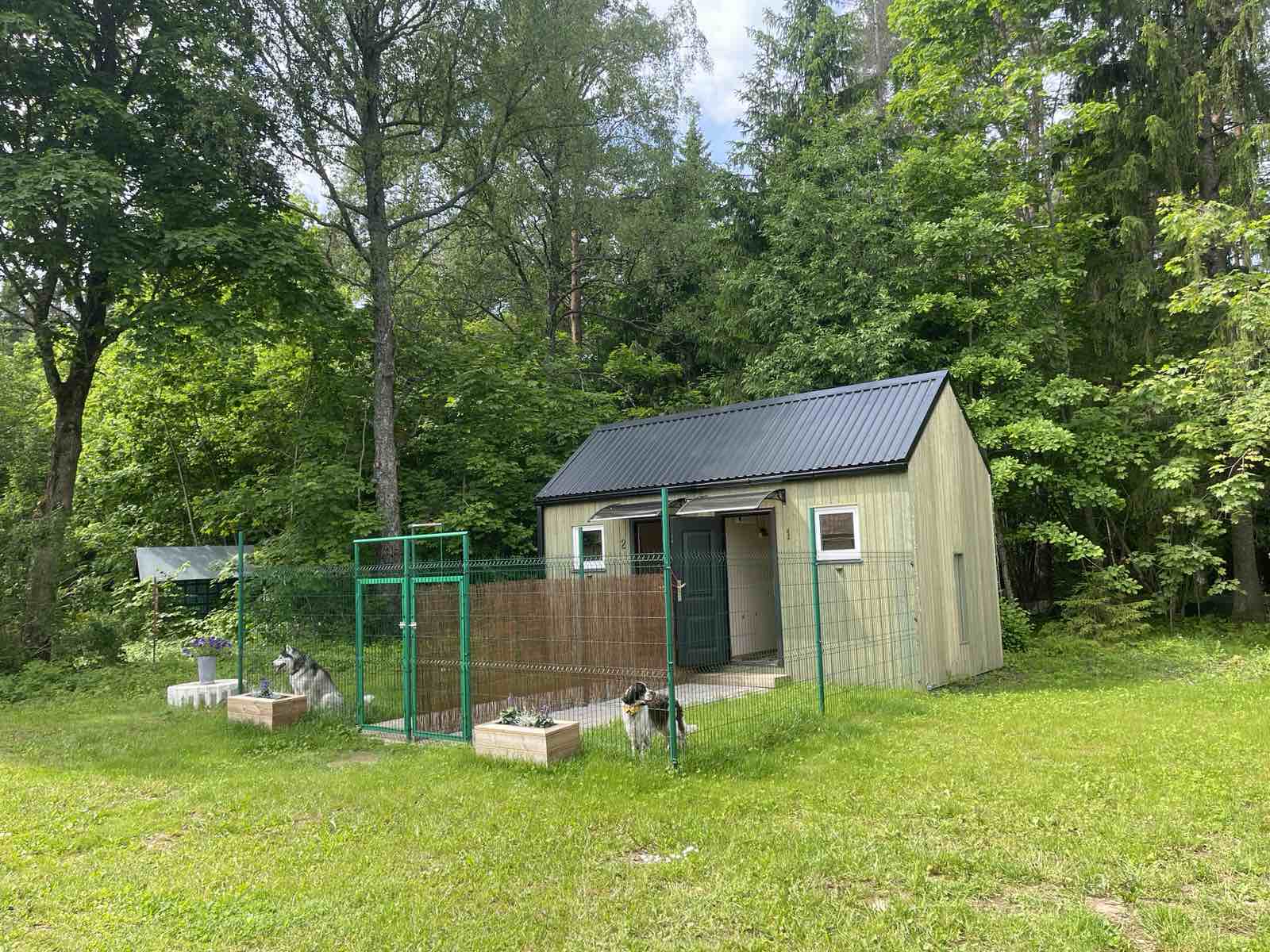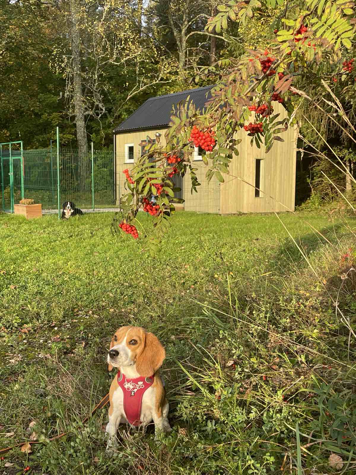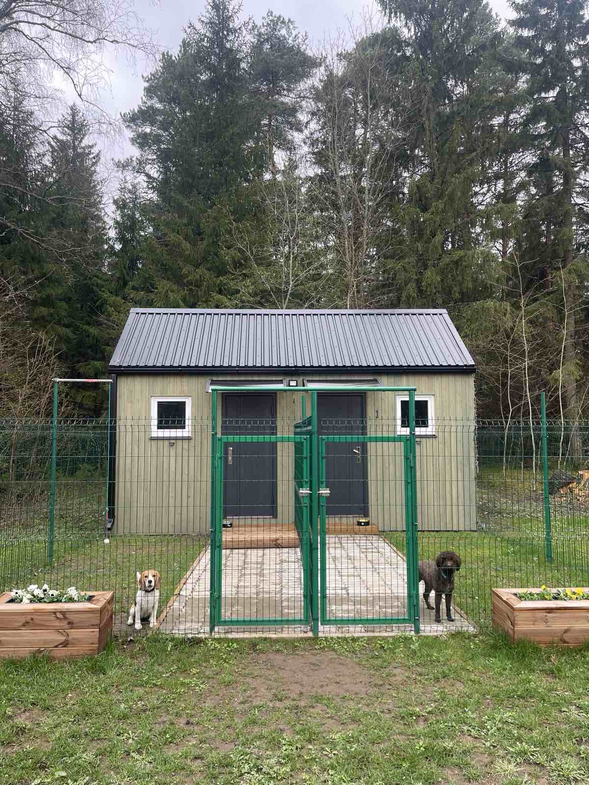 С одной стороны — лес, с другой — поле, а в глубине участка находится уютный дом, где живёт хозяйка, и рядом — наш отель для собак.