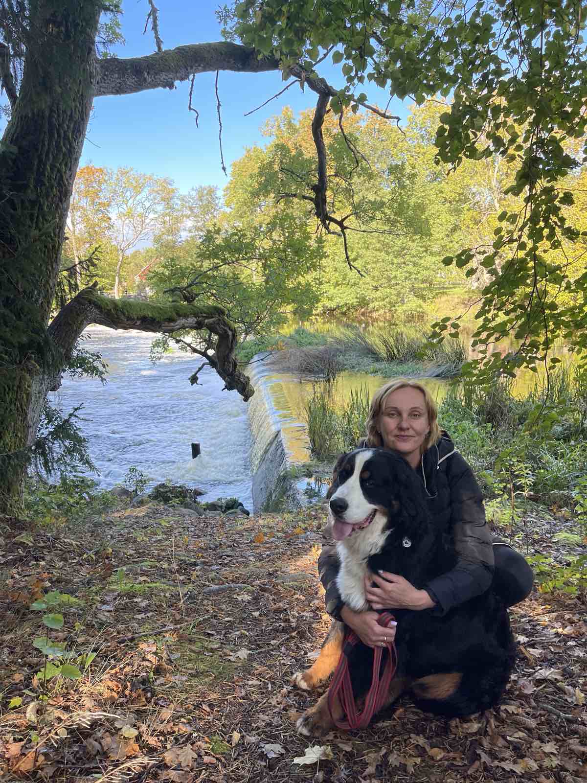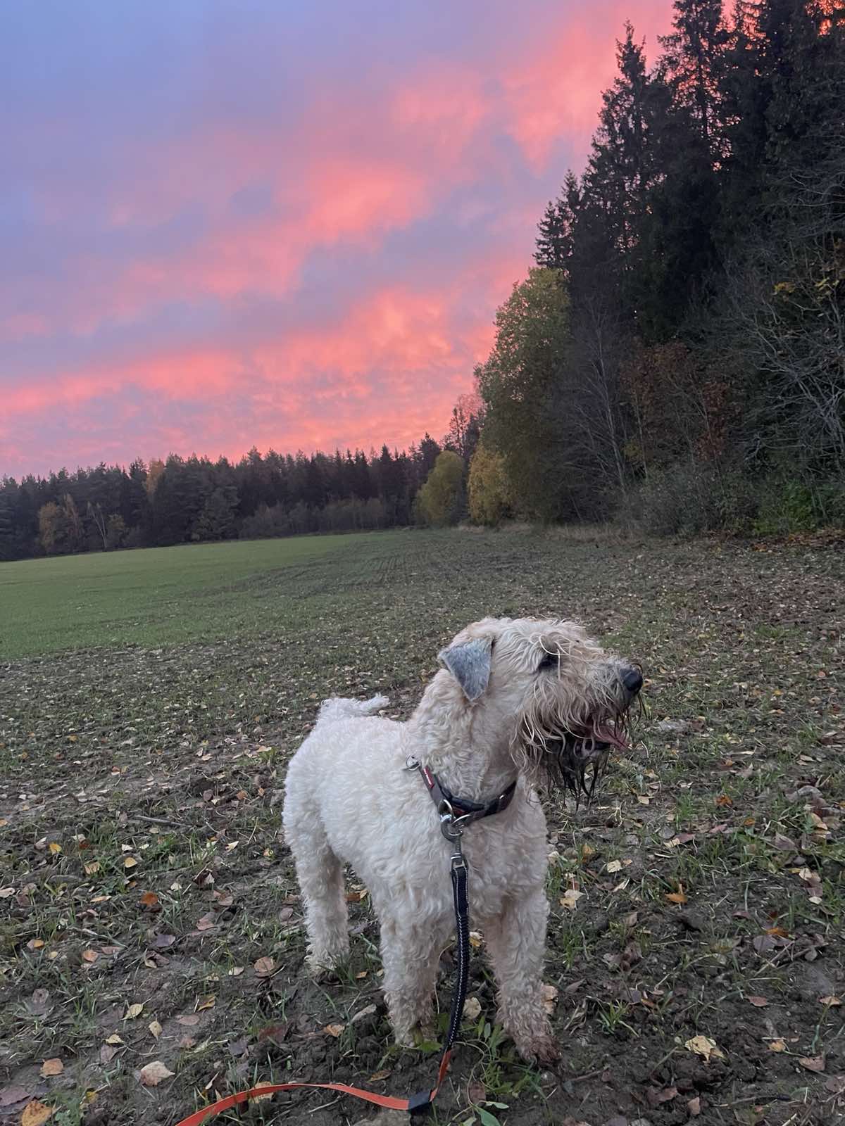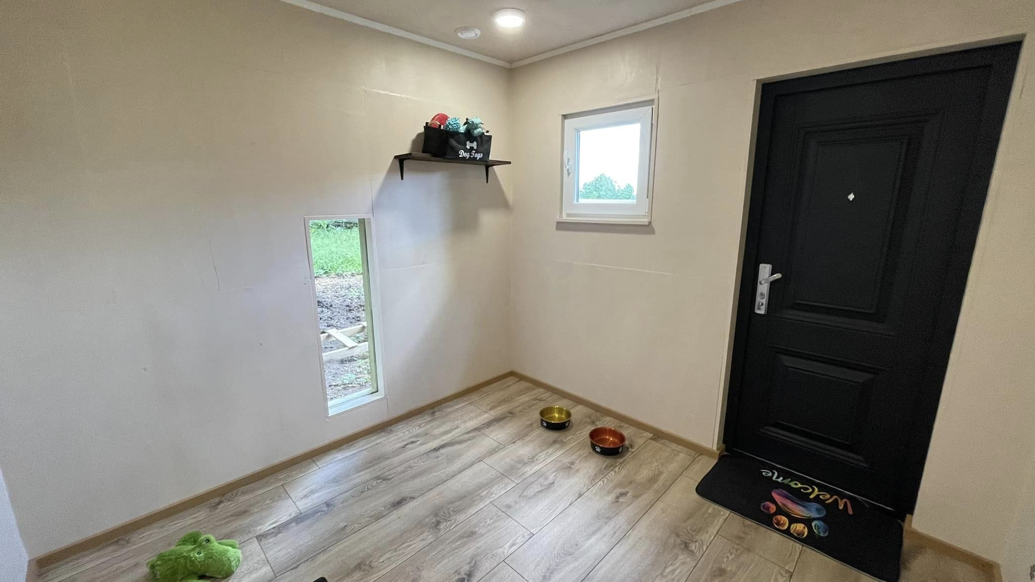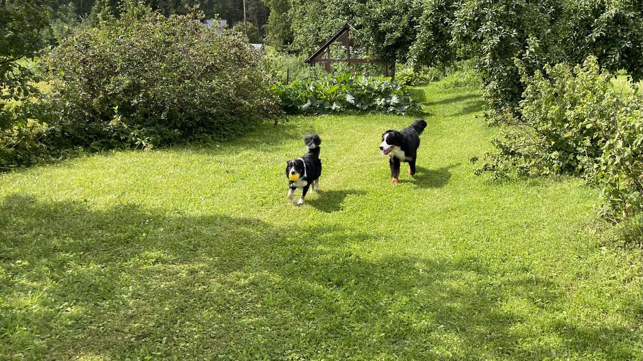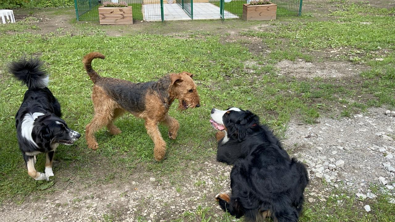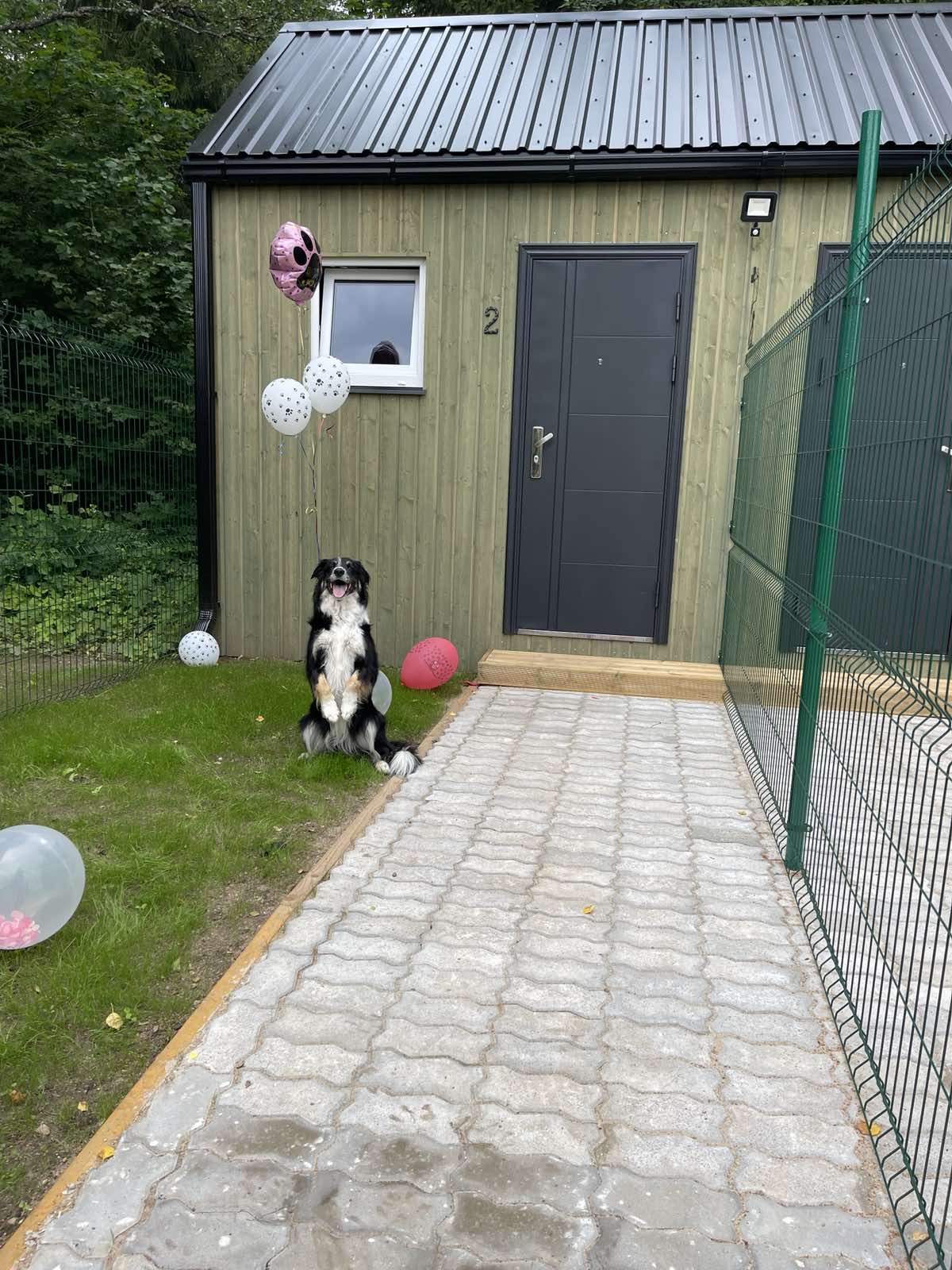 С одной стороны — лес, с другой — поле, а в глубине участка находится уютный дом, где живёт хозяйка, и рядом — наш отель для собак.