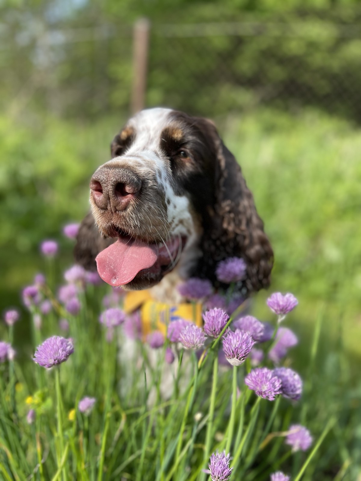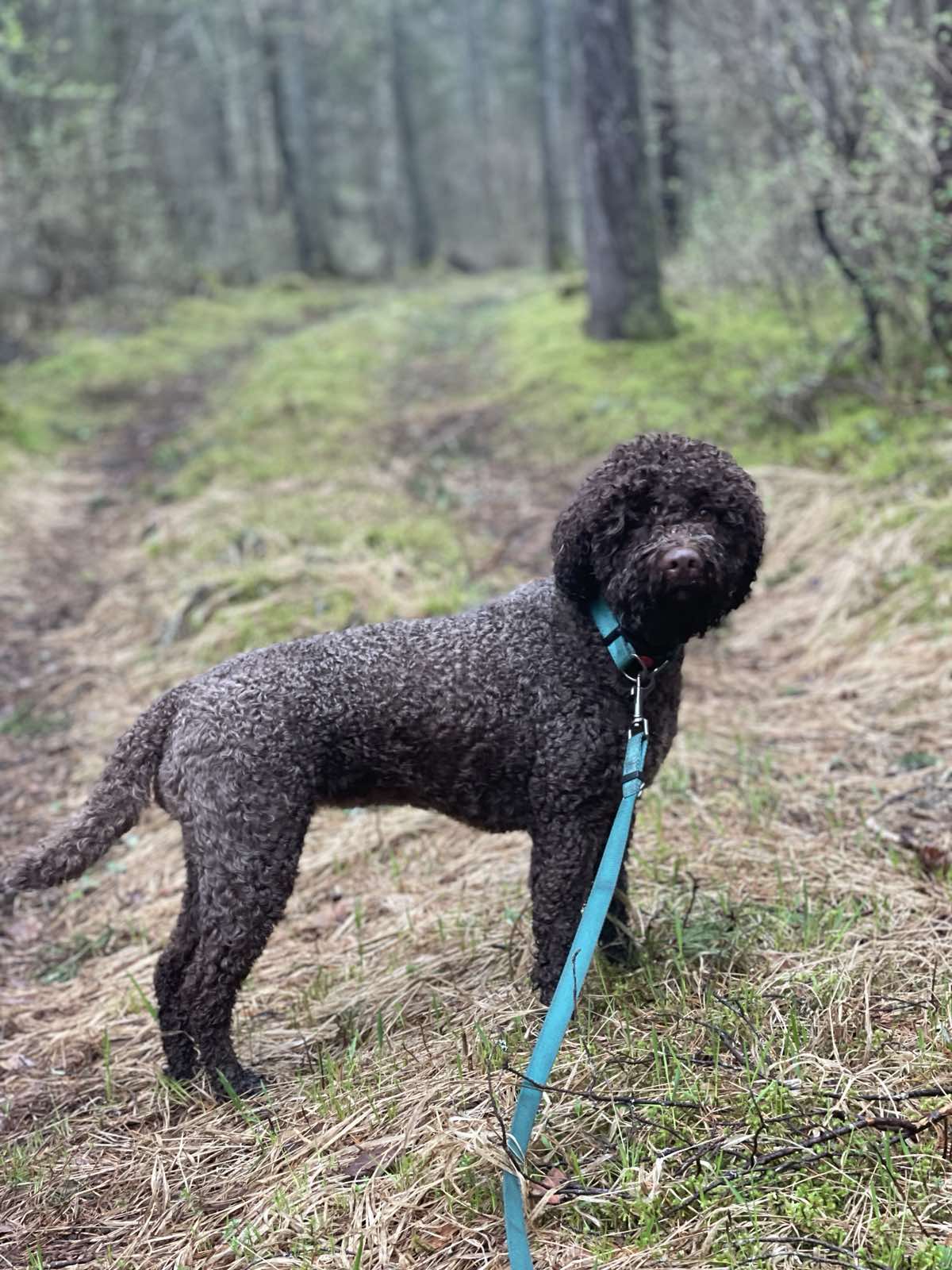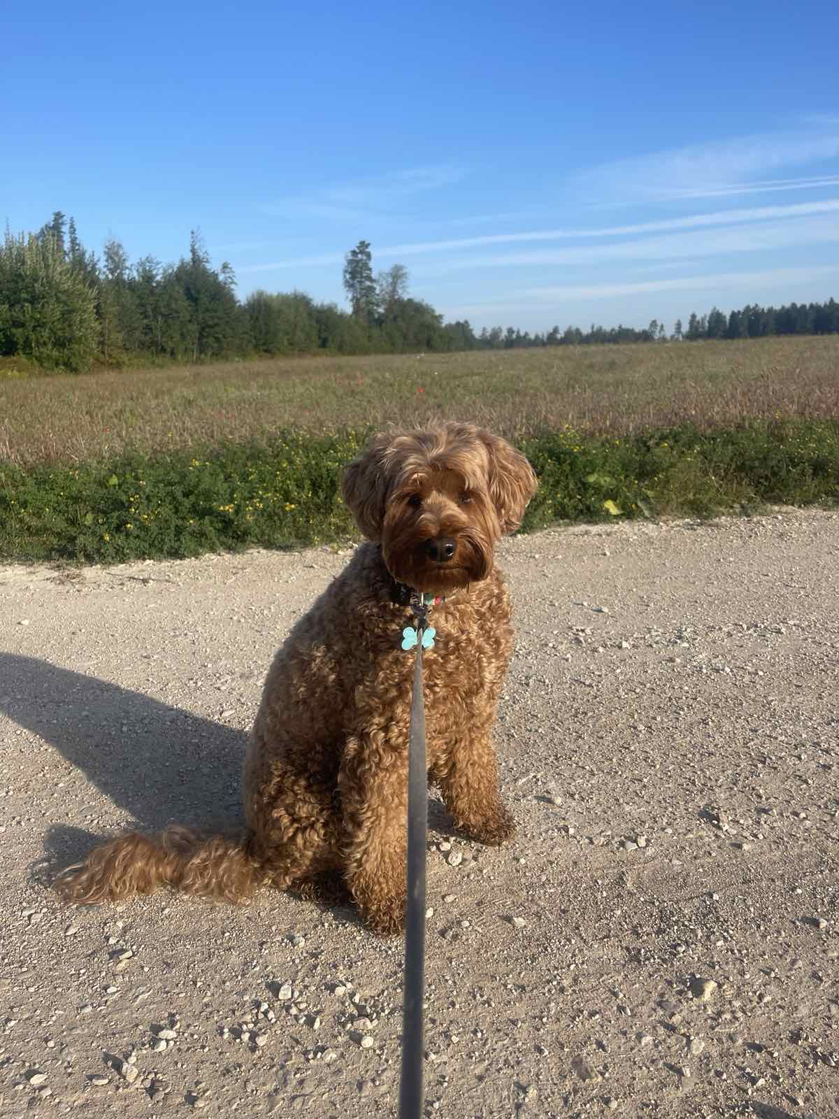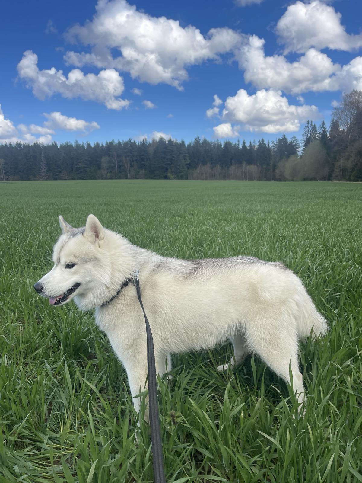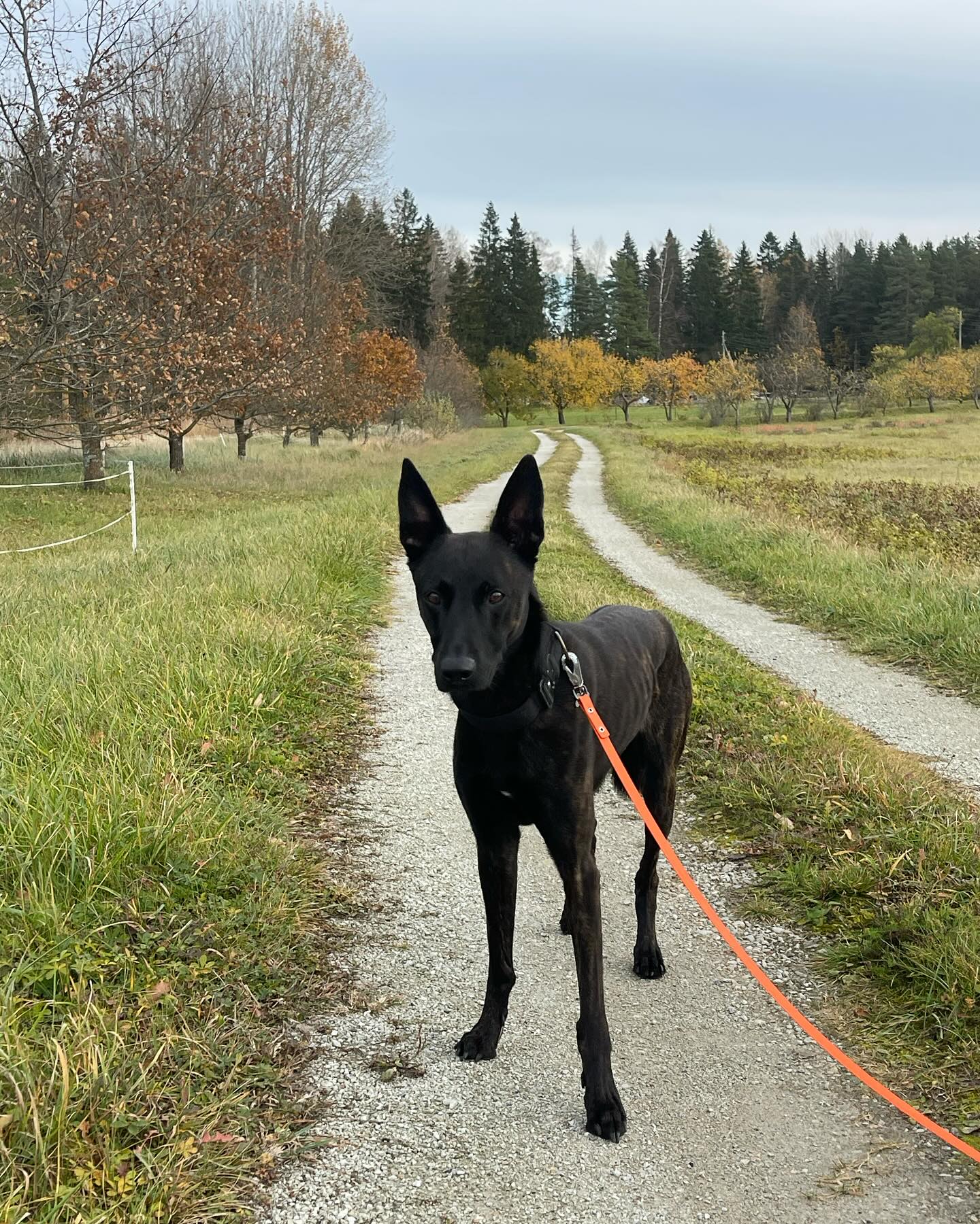 С одной стороны — лес, с другой — поле, а в глубине участка находится уютный дом, где живёт хозяйка, и рядом — наш отель для собак.